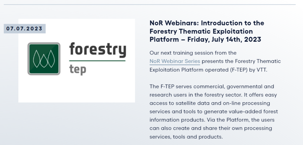 On Friday, 14th July, we are holding a one-hour introductory webinar on Forestry TEP. This event is part of the Network of Resources (NoR) webinar series. You are invited to join to learn about the platform capabilities. You will also hear how you can get free access to the platform via the ESA Network of Resources, as is briefly summarized on our subscription page. Read more and find a sign-up link on the NoR news page!