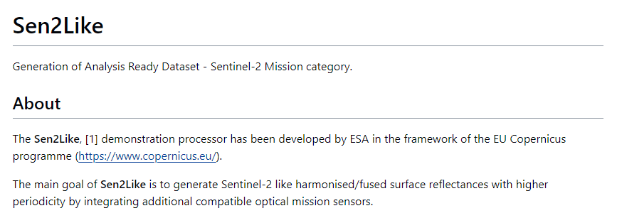 - Sen2Like – generates harmonised/fused surface reflectance products, primarily combining Landsat-8 and Sentinel-2 products to achieve higher amount of harmonized time series data.